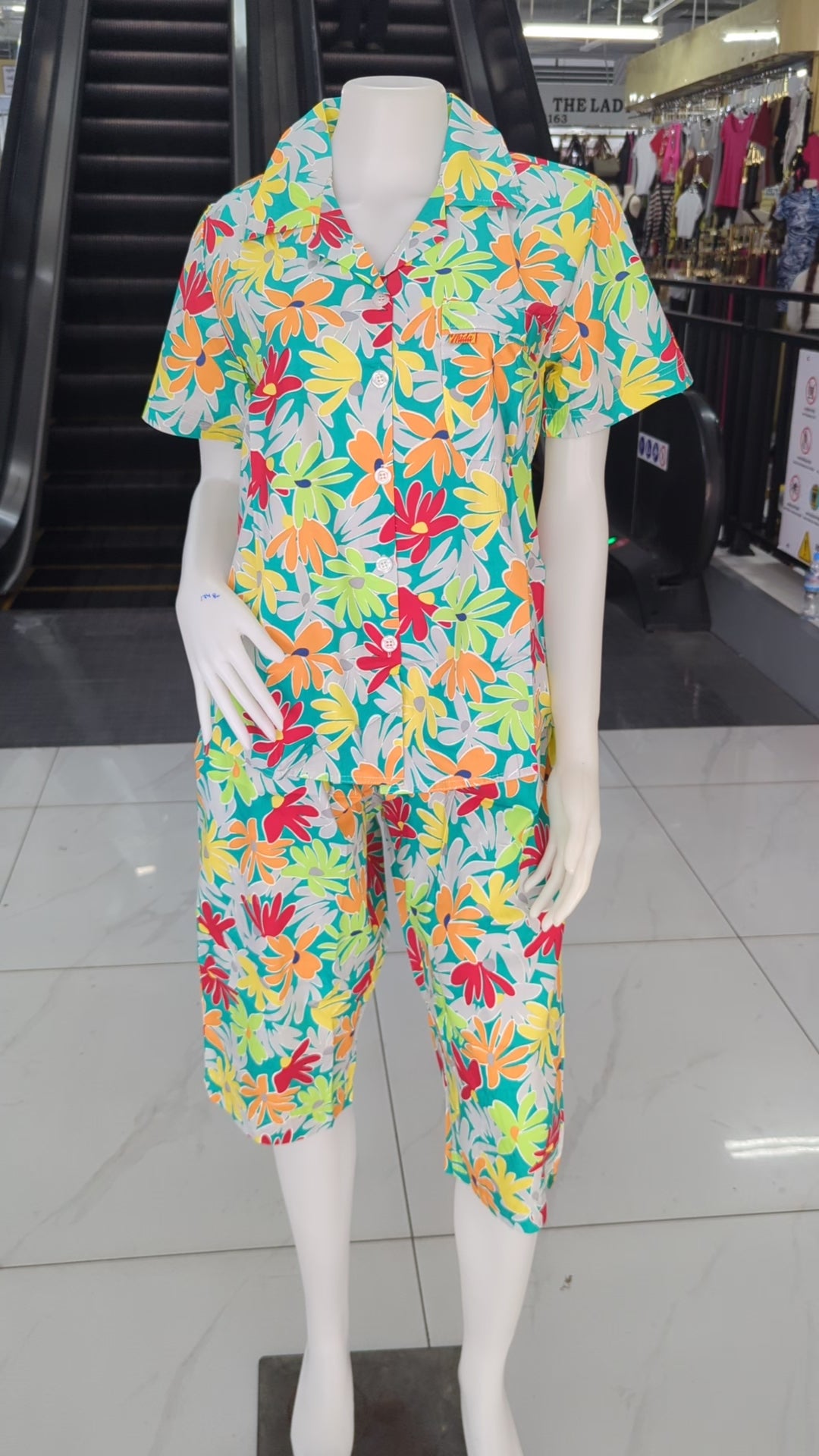 មានជម្រើសជូននារីៗយើង ដែលនិយមចូលចិត្តពាក់ឈុតផ្កាម៉ាក ធីតា ម៉ូដកបើក ដៃវែង ខោជើងវែង ផលិតពីក្រណាត់ Cotton 100% លេខ ១៖